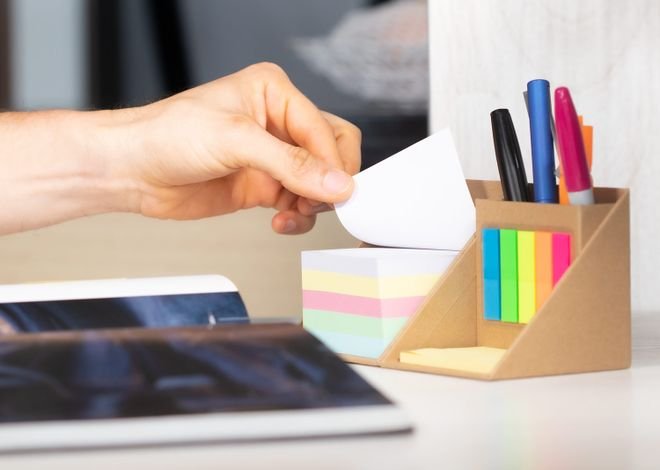 Cubo Oganizador Ecológico está fabricado con cartón reciclado de alta calidad, lo que lo convierte en una elección amigable con el medio ambiente. El conjunto incluye 5 banderitas adhesivas en distintos colores para destacar información importante, un pequeño bloc de notas rectangular de tamaño mediano y un taco de notas en cuatro vibrantes colores para ayudarte a mantener tus tareas y pensamientos organizados.