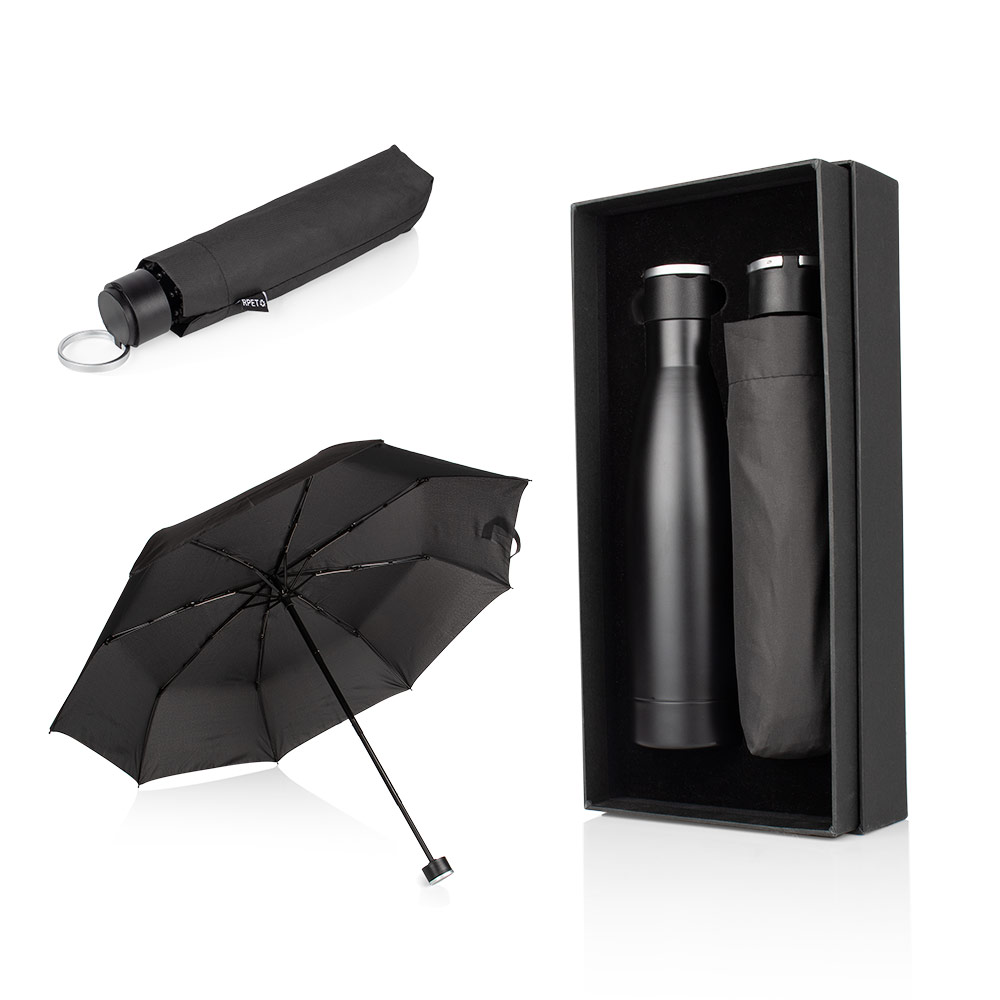 Este kit combina un paraguas ejecutivo de alta cobertura con una botella térmica de acero reciclado, presentado en una elegante caja de regalo ideal para experiencias de marca.