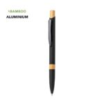 Lapicero en aluminio con detalles en bambú con acabado en goma mate, con sistema de apertura retráctil, clip metálico, parte superior metálico con acabado mate.