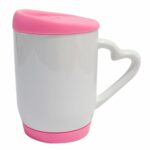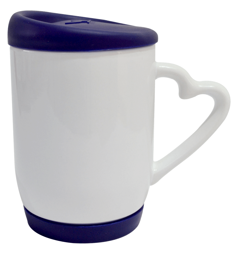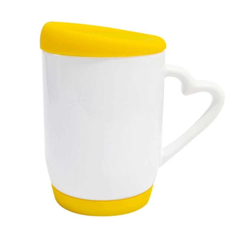 Este práctico y moderno mug curvy de cerámica con oreja en forma de corazón es perfecto para personalizar. Viene con una tapa y base de silicona, disponibles en varios colores, que aseguran comodidad y seguridad al usarlo.